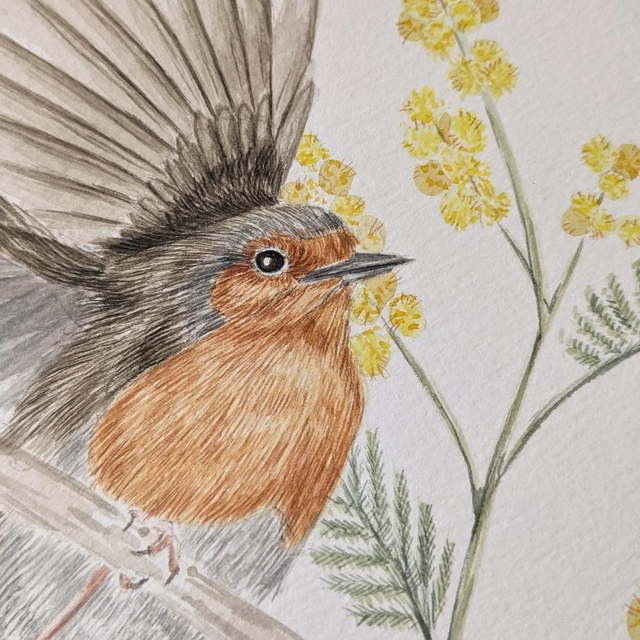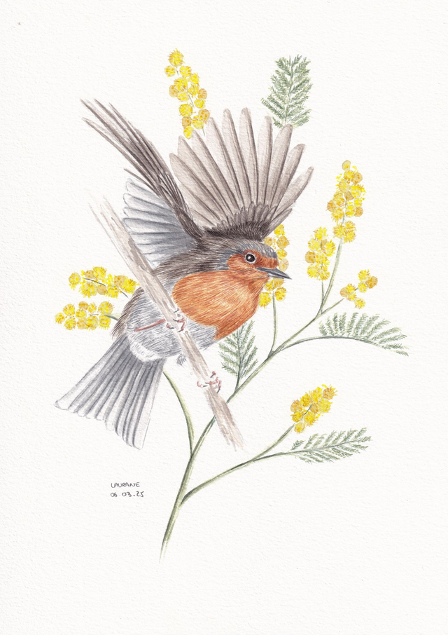 Ajoutez une touche de couleur et de nature à votre intérieur avec cette aquarelle originale représentant un Rougegorge familier accompagnée de mimosa. Il s'agit d'une espèce très peu farouche qui s'installe volontiers dans nos jardins. Réalisée entièrement à la main, cette pièce unique s’inscrit dans la mini-collection "Les Messagers du printemps", célébrant les oiseaux qui pour moi accompagnent le renouveau du printemps.