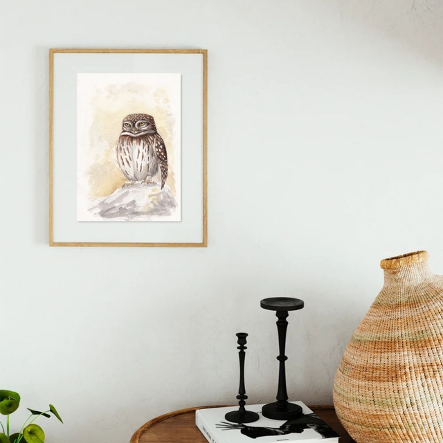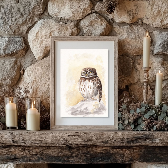 Cette aquarelle représente une Chevêche d'Athéna boudeuse. Cette espèce est connue pour son côté expressif, elle semble souvent faire la tête ! Cette chouette serait ravie de vous accompagner au bureau le lundi matin.