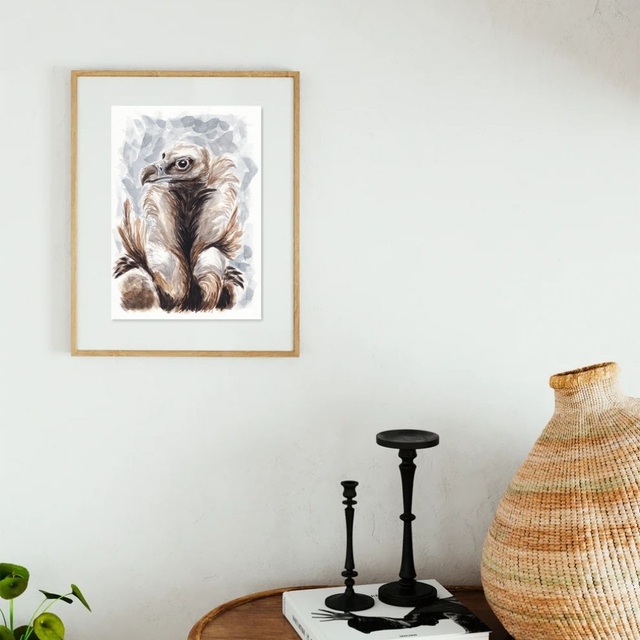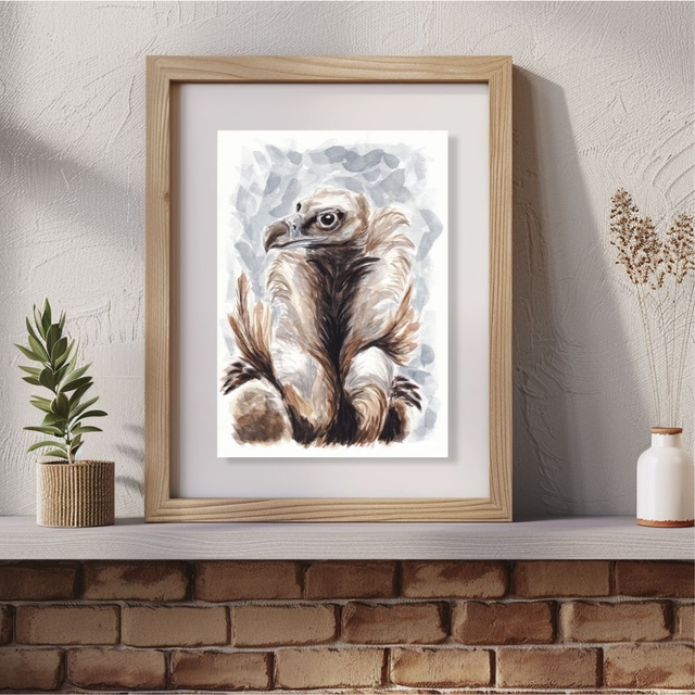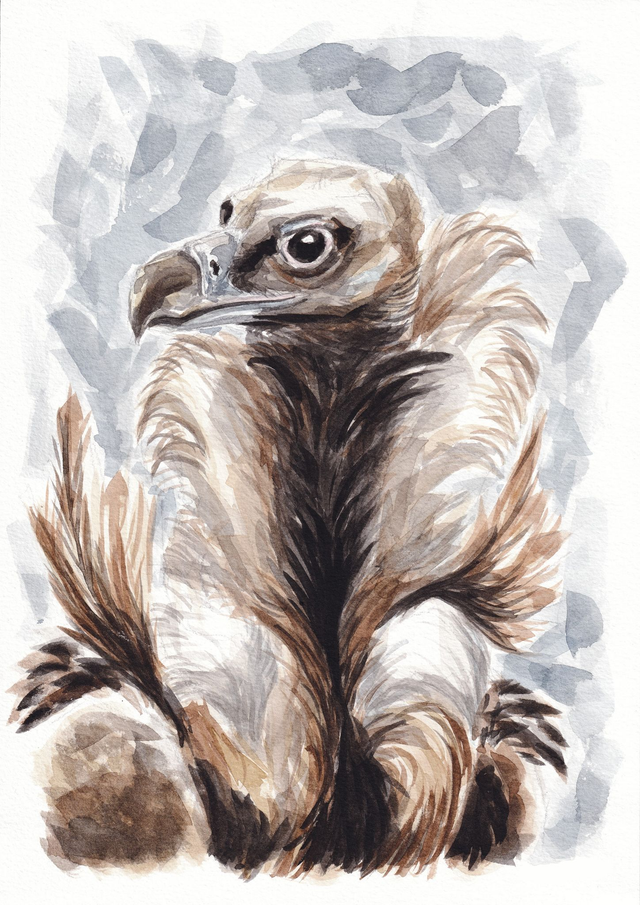 Cette aquarelle représente un portrait de Vautour moine. Tiré de la collection "les nettoyeurs", ce portrait invite à la contemplation de cet oiseau mal-aimé. Découvrez le autrement et plongez vous dans la douceur de son regard. Ce vautour mérite-t-il sa mauvaise réputation ?