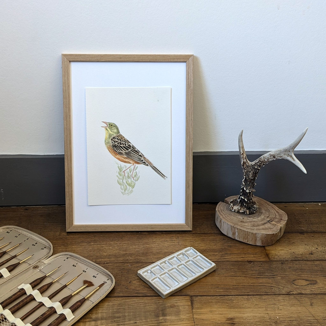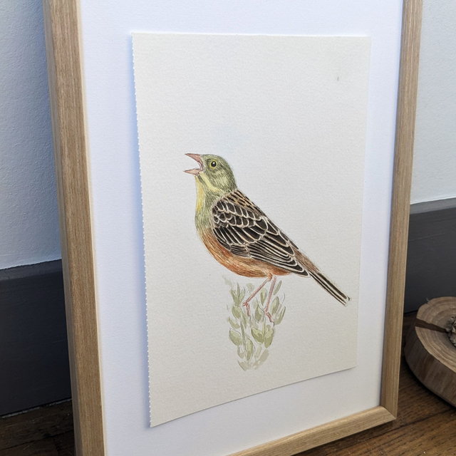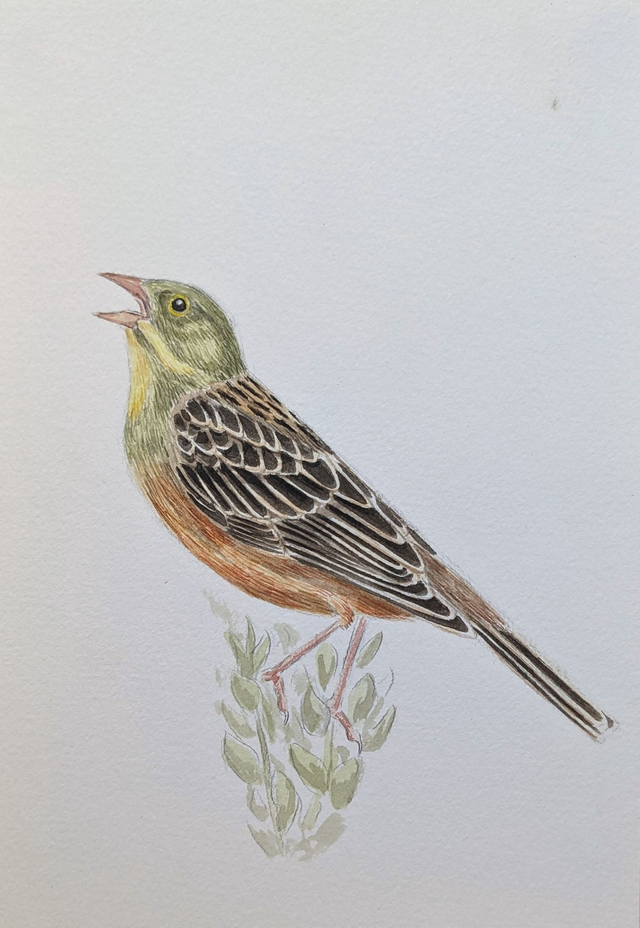 "Le chanteur" représente un Bruant ortolan, l'oiseau qui m'a menée à l'ornithologie est qui est donc à l'origine de mon amour pour les oiseaux. Le Bruant ortolan est un oiseaux qui fréquente les milieux agricoles. Son chant se compose de la répétition d'une même note mélancolique et se finit par une longue note plus grave. Il apprécie se poster en hauteur tôt le matin afin d'être sûr d'être entendu.