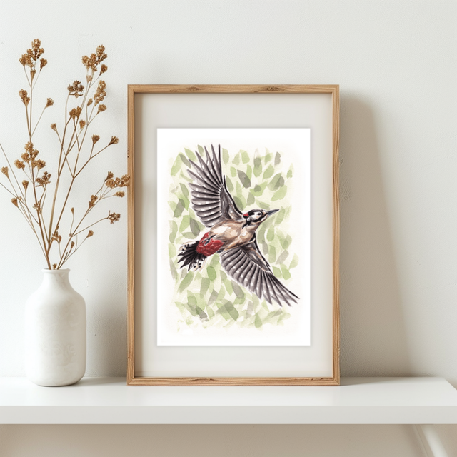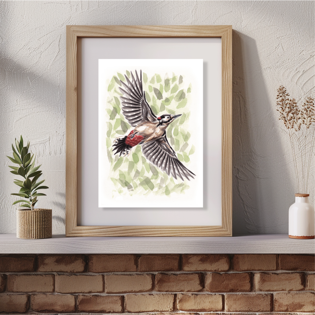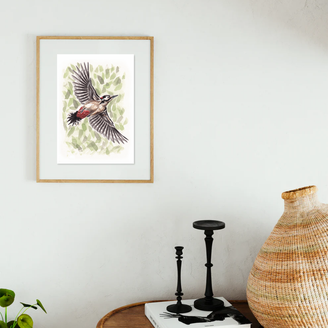 Cette aquarelle représente un Pic épeiche, oiseau qu'on entend tambouriner plus souvent qu'on l'observe ! Tirée de la série d'aquarelles originales "voisins à plumes", cette illustration est faite pour tous les amoureux des oiseaux qui prennent encore le temps d'observer les espèces les plus communes comme au premier jour.